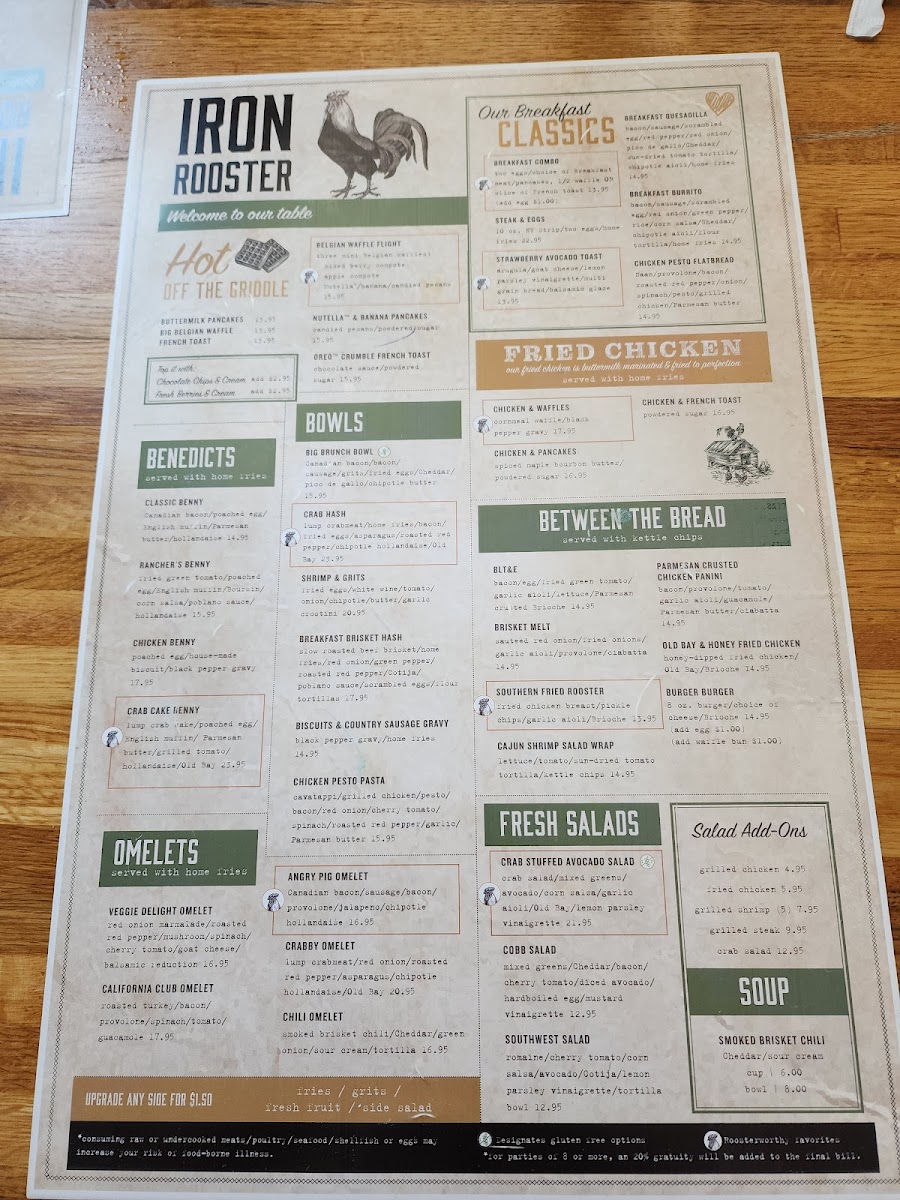 buttermilk marinated fried chicken breast / cornmeal waffle / black pepper pan gravy / home fries